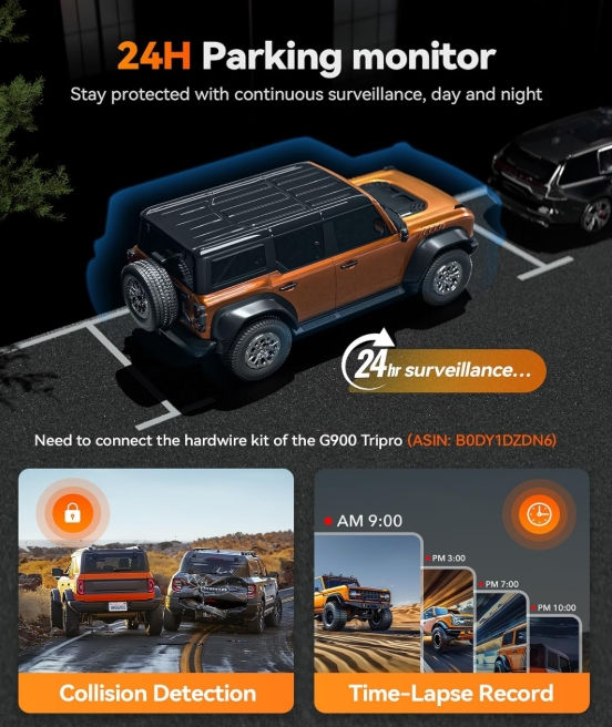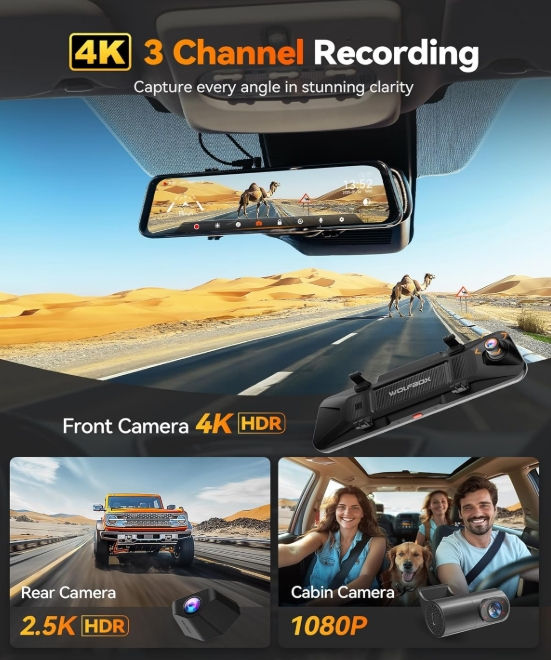 WOLFBOX Cámara de espejo retrovisor G900 Tripro versión de cabina de 3 canales 4K, STARVIS 2 IMX678 visión nocturna, 4K+1080P+2.5K espejo delantero interior y trasero, WiFi de 5.8 GHz, control de voz + HARDWIRING KIT + CPL FILTRO + INSTALACION PROFESIONAL